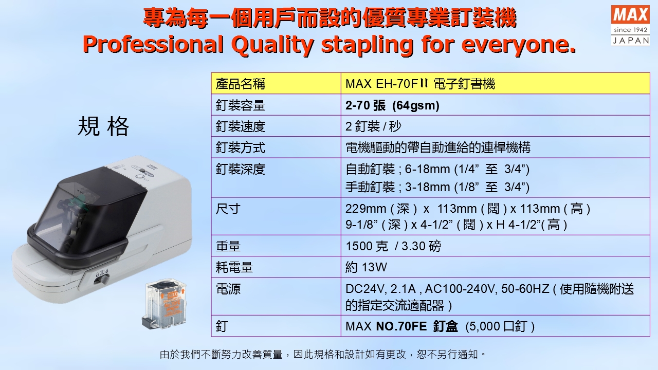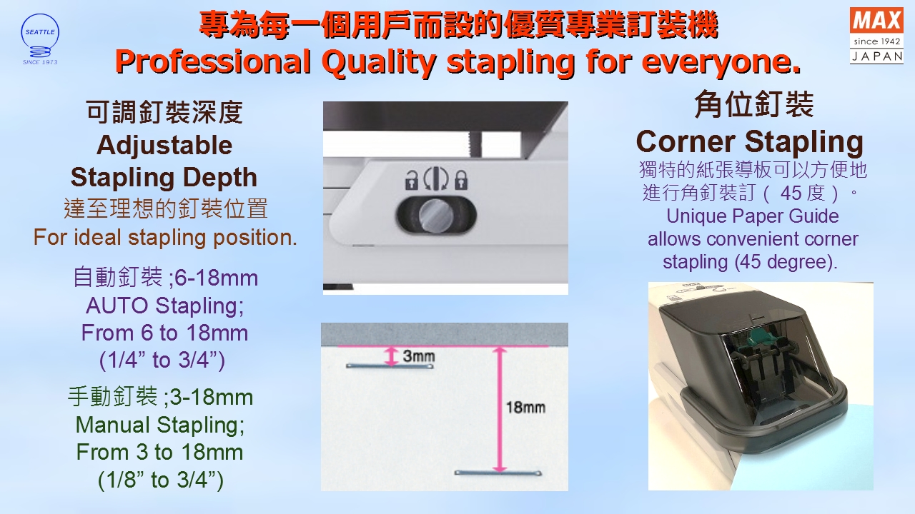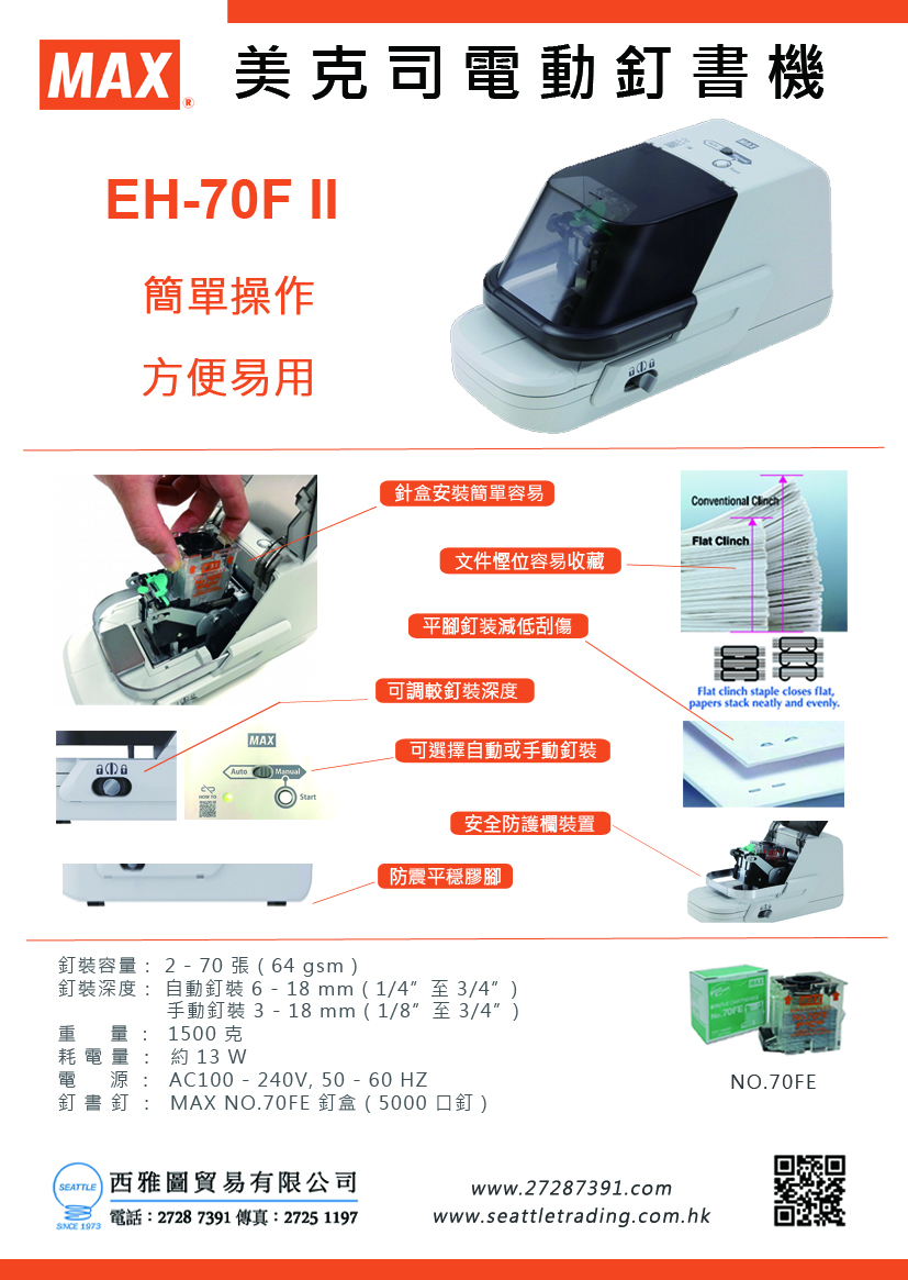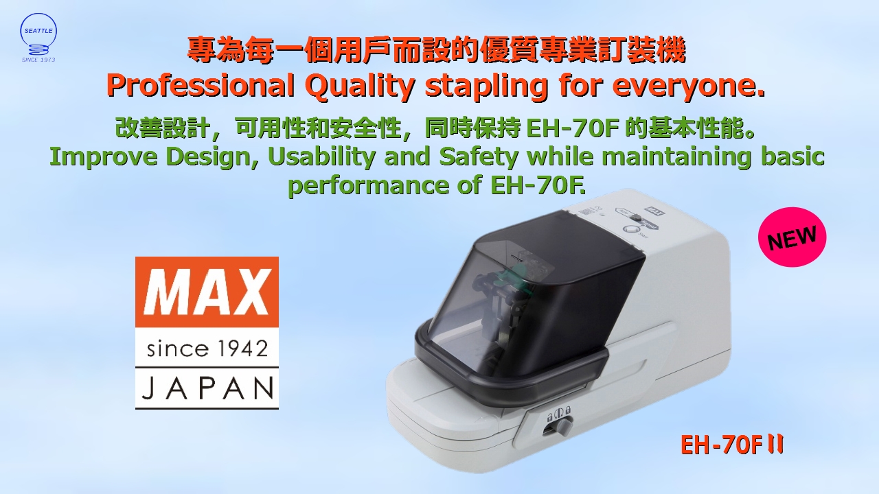 MAX 日本美克司各類產品 :MAX 美克司 EH-EH-70F 2 電動釘書機, MAX 美克司 EH-EH-70F II 電動釘書機, MAX 美克司 EH-EH-70F2 電動釘書機, MAX 美克司 EH-EH-70F 2 電動釘裝機, MAX 美克司RC-20S手動支票機、 MAX 美克司EC-30A電動支票機、 MAX 美克司EC-70電動支票機、 MAX 美克司 EH-110F 電動釘書機、 MAX 美克司PH-15DS手動纸釘釘書機、 MAX 美克司EH-20F電動釘書機、 MAX 美克司EH-70F電動釘書機、 MAX 美克司ER-1600全自動電子打咭鐘機、 MAX 美克司ER-2500全自動電子打咭鐘機、 MAX 美克司ER-2700全自動電子打咭鐘機、 MAX 美克司CPM-100HG3印膠貼割字割圖機、 MAX 美克司 CPM-200G 印膠貼割字割圖機、 MAX 美克司RC-50B原廠支票機黑色色轆、 MAX 美克司RC-50R原廠支票機紅色色轆、 MAX 美克司T8原廠打工咭紙、 MAX 美克司ER-IR103原廠打咭鐘機色帶、 MAX 美克司ER-IR100E原廠打咭鐘機色帶、 MAX 美克司ER-IR102E原廠打咭鐘機色帶、 MAX 美克司CPM-100HG3印膠貼割字割圖機色帶、 歡迎親臨美克司陳列室參觀示範,MAX 日本美克司商業機器產品總代理/總經銷:西雅圖貿易有限公司,查詢電話:(852) 2728 7391 傳真號碼: (852) 2725 1197 電郵地址: customeer@seattletrading.com.hk